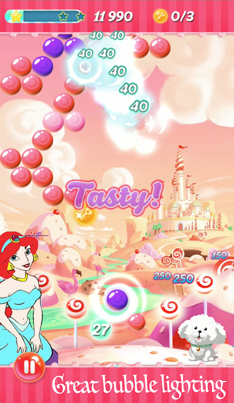 Match at least three candy bubbles of the same colour to burst them and remove them from the field. Try to drop big bubble clusters to earn delicious bonus points and complete the level's goal to move forward. Can you earn all three stars? You will enjoy the journey of bubble shooter.