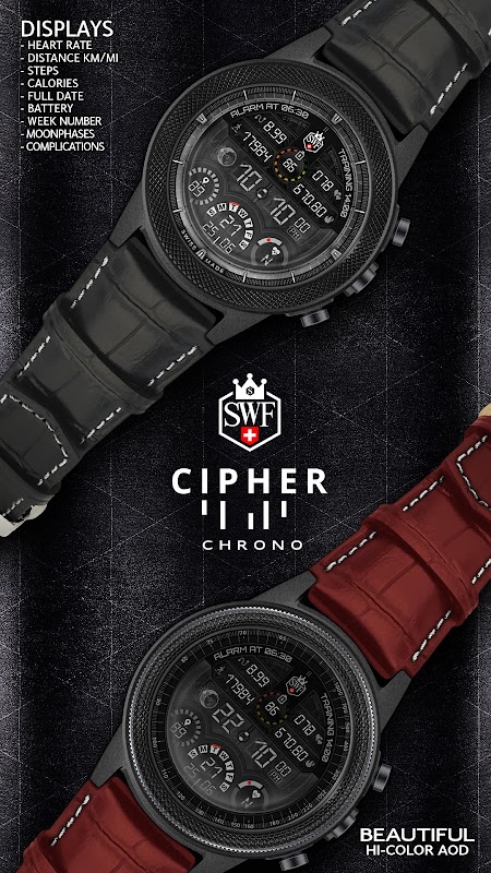ساعتهای SWF سوئیس در سوئیس ساخته و ساخته شدهاند و جزئیات بسیار بالایی را نشان میدهند. SWF Cipher شامل یک ساعت متحرک زیبا و صفحه ساعت AOD رنگی برای ساعت شما است، بنابراین می توانید در حین حرکت ساعت خود را همیشه روشن بگذارید.