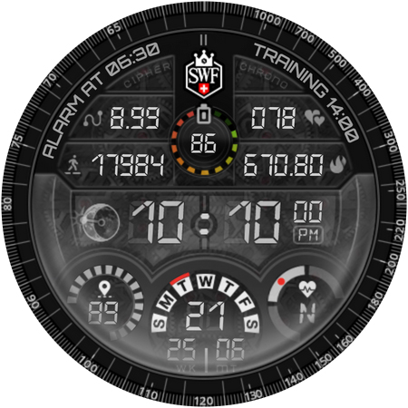با طراحی واضح و مدرن، نسخه SWF Cipher Chrono برای راهنمایی شما در زمان هر روز ساخته شده است. ساعت متحرک فوقالعاده در پسزمینه را تحسین کنید، در حالی که در پیشزمینه، اکثر اطلاعات ساعت هوشمند در یک نگاه نمایش داده میشوند.