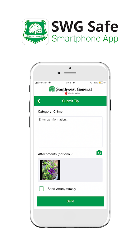 پیام های -Send متن، و همچنین عکس ها و فیلم ها از راهنمایی جرم و رفتار مشکوک به طور مستقیم به نیروهای ایمنی دانشگاه.