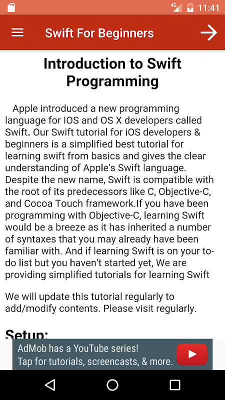All are eager to learn Apple's new programming language called Swift. From ProgramTeach(http://www.programteach.com), we are providing an offline free android application for Beginners who just want to start learning Swift. Here we are covering following topics to make you understandable easier through simple English.