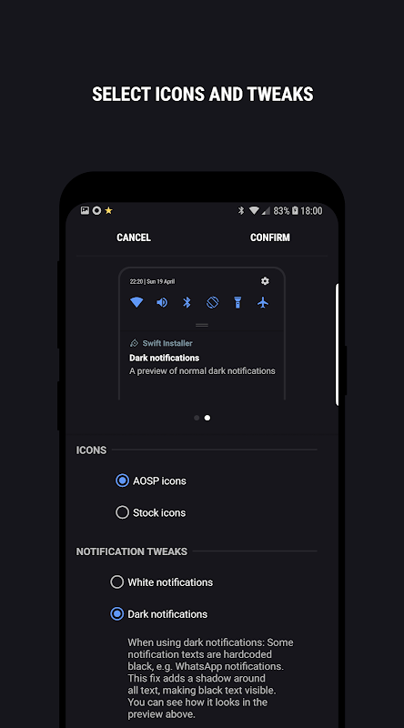 Swift Installer packages what's best with the Swift Substratum themes, and comes with its own installer and color engine! You can now install Swift Themes and tweak everything about it. The color choices are almost infinitive, as you can input your own favourite hex color code for dark backgrounds and accents. Around 200 apps are currently themed.