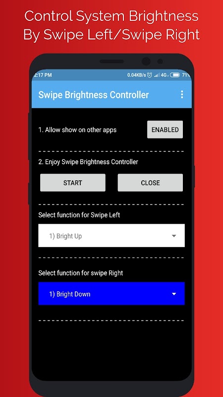 Swipe Brightness Controller is very useful app. You can Increase/Decrease Brightness quickly with swipe left,swipe right..
