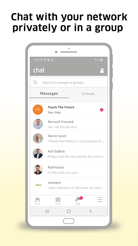 - با سایر شرکت کنندگان ، حامیان مالی ، بلندگوها از طریق پیام کوتاه ، تماس صوتی یا تصویری و تبادل نظر در چت گروهی بحث کنید.
