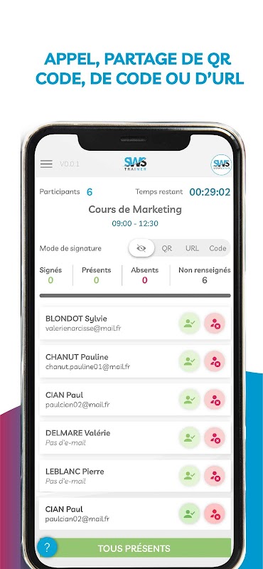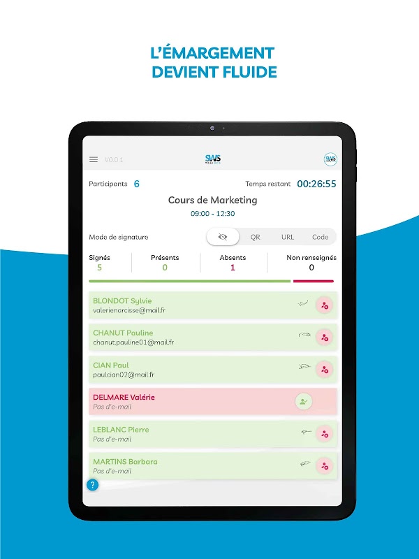 هنگام شروع برنامه ، یک صفحه امضا ظاهر می شود. این امکان را برای شما فراهم می کند تا تمام درخواست های معلق خود را امضا کنید: پیشرفت ها ، امضای از راه دور ... سپس قبل از دسترسی به صفحه اصلی با لیست زبان آموزان این جلسه ، برای جلسه فعلی ثبت نام کنید.