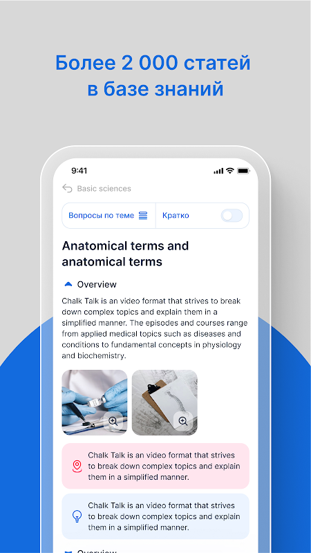 پایگاه دانش، که در حال حاضر حاوی اطلاعاتی در مورد بیش از 500 بیماری است که به 25 رشته مختلف مربوط می شود. هر مقاله به بازگویی توصیههای بالینی داخلی محدود نمیشود - این یک ترکیب متفکرانه از آخرین دستورالعملهای خارجی و روسی زبان، بهترین کتابهای درسی و مطالب جوامع پیشرو جهان است.