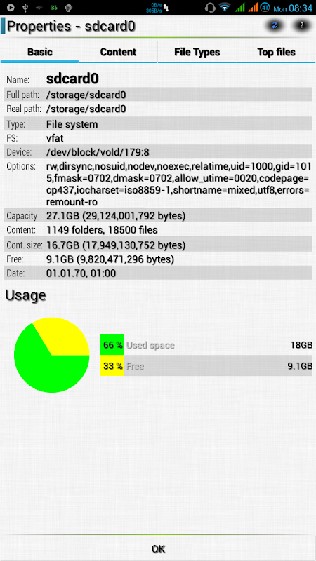 * detailed Storage Analysis - shown details about storage (sdcard, int.storage), largest files + folders, filetypes - user can delete files/folder directly from Storage Analysis! * storage list (system mountpoints)