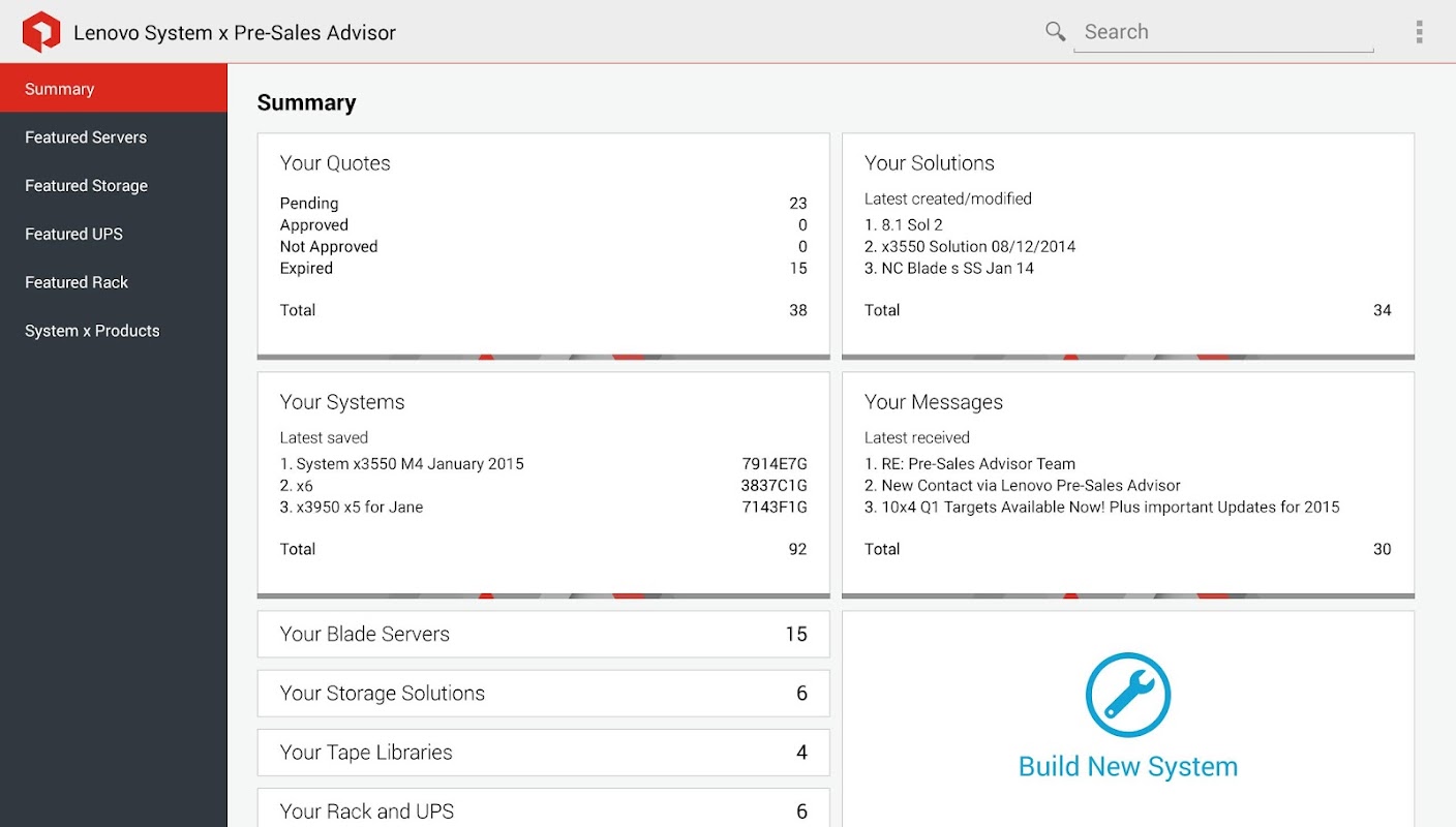 Lenovo System x Pre-Sales Advisor helps you easily work from reliable, up to date data with the ultimate goal of delivering accurately configured products and pricing. It provides fast access to unprecedented levels of information on Lenovo System x products in a context sensitive, user friendly fashion.