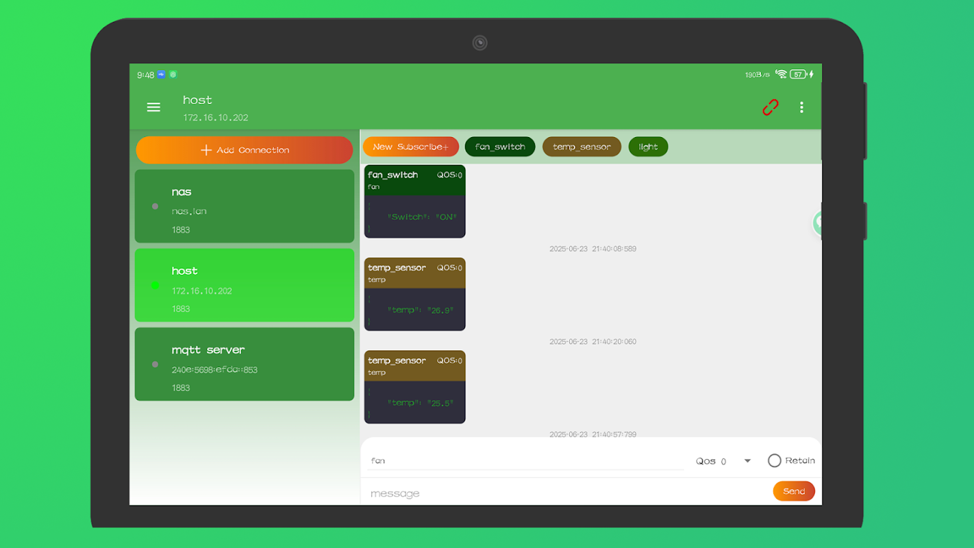 این کلاینت پیشرفته MQTT که برای دستگاههای صفحه بزرگ بهینه شده است، مدیریت چند سرور، پیامرسانی همزمان، و یک رابط بصری کارآمد را ادغام میکند - کاملاً برای محیطهای پیچیده اینترنت اشیا مناسب است.