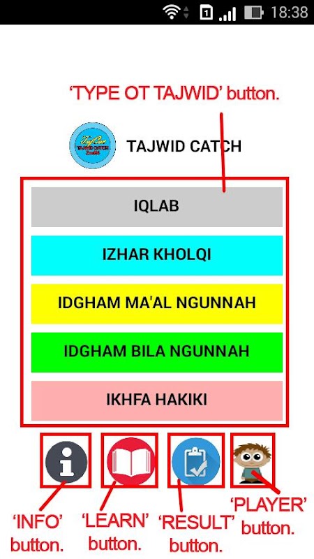 این برنامه همچنین به شما اجازه بازیکن در مورد حروف تجوید اول یاد بگیرند. فقط با کلیک بر روی دکمه 'یادگیری'، سپس مراحل بعدی ارائه شده. در حال حاضر، صدا برای هر نامه وجود دارد. بنابراین، شما می توانند یاد بگیرند که چگونه به ضمیر نامه به درستی.