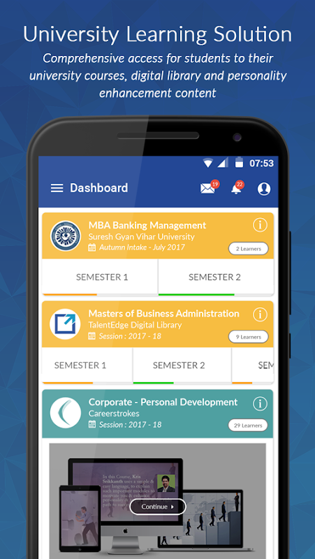 Presenting the all new Talentedge app! Along with the regular courses subscribers the Talentedge app is now accessible by users of enterprise solution, university learning solution as well. The learners on the mobile application will be able to do the following -