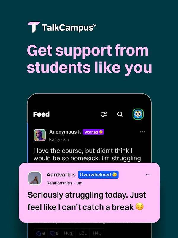 TalkCampus یک شبکه جهانی پشتیبانی از همتایان است که فقط برای دانشآموزان طراحی شده است و فضای امنی را برای به اشتراک گذاشتن آنچه میگذرانید، ارتباط با دیگرانی که آن را دریافت میکنند، ارائه میدهد و احساس میکنید در هر زمانی از روز یا شب شنیده میشوند.