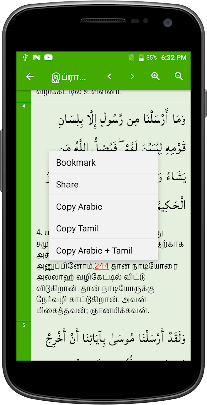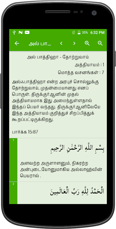 வசதிகளை குர்ஆன் வசனங்களின் இடது புறமுள்ள பச்சை நிற எண் வரிசைகளை அழுத்துவதன் மூலம் பெற்றுக்.