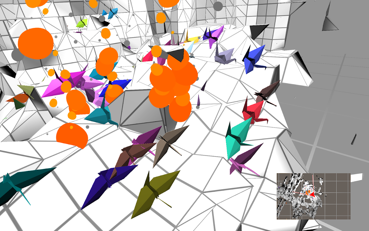 Plaster voxel geometry of your environment with origami cranes. Then blow them up. Tap to fire.