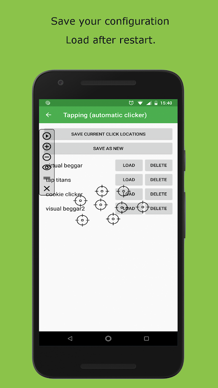 Tapping features a floating control panel to start/end the automatic clicking. You can add any click points on the screen with the control panel.