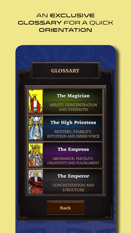 به این ترتیب، برنامه Tarot Reading and Mystical Guide با برجسته کردن 22 کارت از arcana اصلی، با هدف ارائه یک نتیجه قاطعانه و عرفانی تر توسعه داده شد. تاروت نه تنها مسیری را که باید دنبال کنید را نشان می دهد، بلکه گزینه ها و بازتاب های سفر شما را نشان می دهد، به همین دلیل است که گزینه خواندن روزانه در دسترس است.