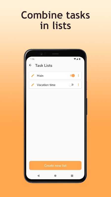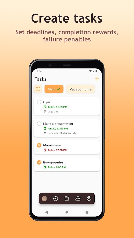 در برنامه شما می توانید وظایف خود (ترکیب شده در لیست ها)، عادت ها و پاداش ها را ایجاد کنید.