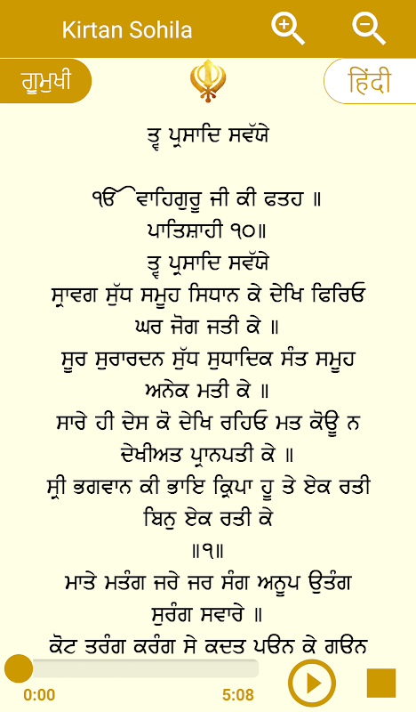 * برنامه شامل مسیر کامل Tav Prasad Savaiye به زبان هندی و Gurmukhi است.