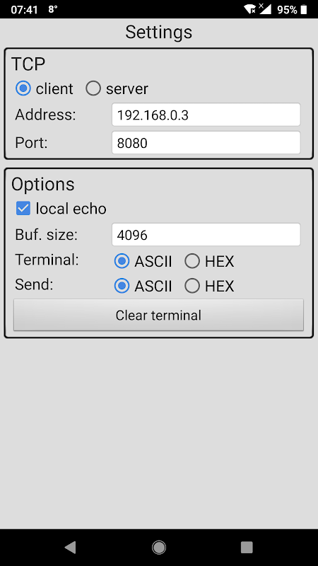Terminal app to send and receive ASCII text / HEX data to a TCP Socket.