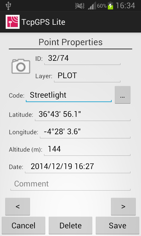 The points are automatically numbered and is registered the latitude, longitude and date/time. Optionally, you can be separated into different layers and also you can be associated to a picture, a comment and codes to differentiate it. The application stores the values most habitually to these codes and allows choosing them from a quick list.