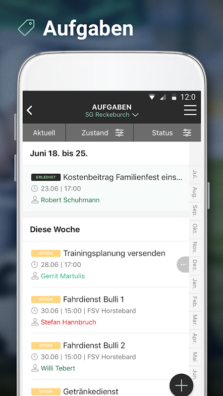 همه بازیکنان ثبت نام شده برای تیم در DFBnet در برنامه نمایش داده می شوند و می توانند به راحتی از طریق واتس اپ، ایمیل یا پیامک دعوت شوند. بازیکنان و مربیان اضافی می توانند اضافه شوند.