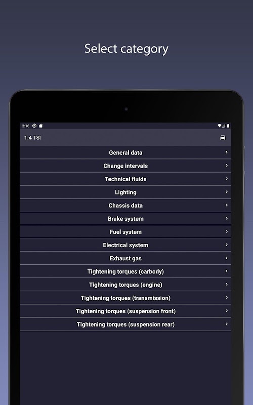 اطلاعات به دسته ها تقسیم می شوند: اطلاعات عمومی ، شاسی ، گشتاور محکم پیچ و مهره ، سیستم سوخت ، سیستم ترمز ، لامپ های روشنایی ، فواصل تعویض و حجم مایعات فنی.