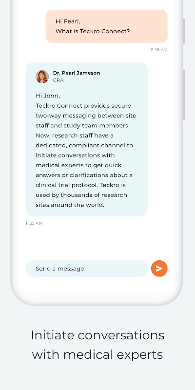 Teckro Connect is a secure, dedicated and compliant communication channel that directly connects research staff with experts. Using a single Teckro account, Teckro Connect directly connects research staff with experts. Study teams can assign medical monitors and other specialists to specific groups with research staff. No question goes unanswered. And research staff don’t need to worry about keeping track if a contact changes. They just initiate a message to the group to ask for help.