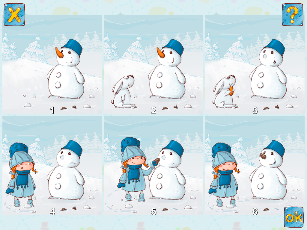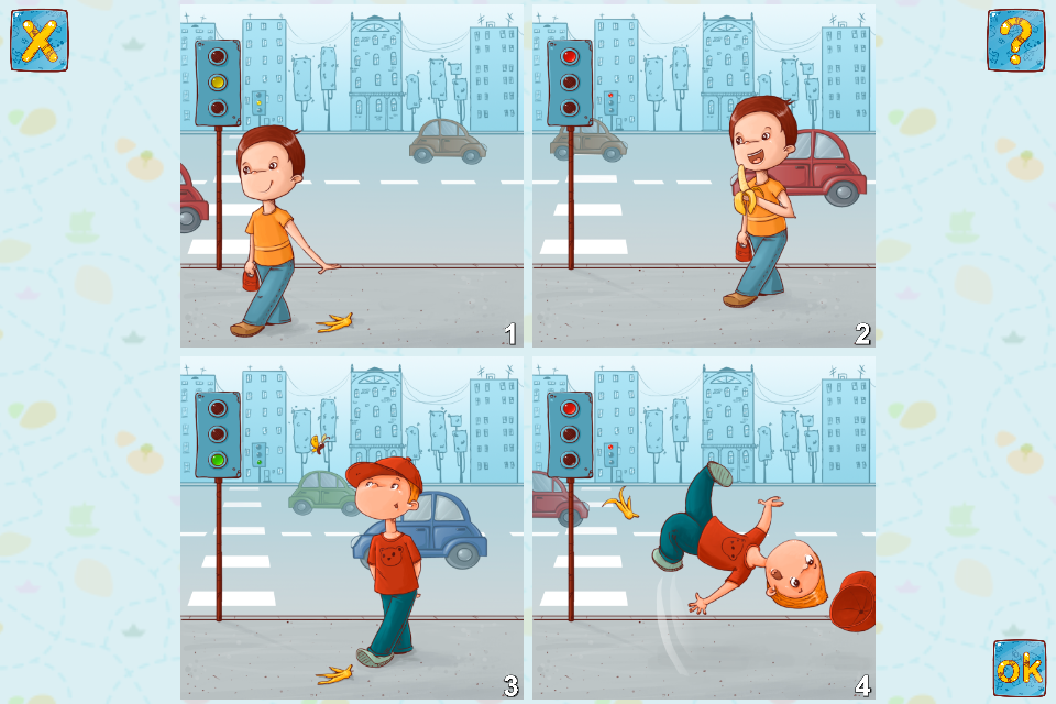 هر یک از وظایف ارائه یک دنباله ای از تصاویر بر روی صفحه نمایش است که با هم یک داستان، با این حال تصاویر مخلوط در آغاز دور. کودک برای قرار دادن تصاویر به جهت درست و داستان این تصاویر نمایش است. بازی به طور موثر آموزش توانایی صحبت در جملات کامل و معنی دار و همچنین برای آمدن به نتیجه گیری های منطقی بر اساس حقایق مشاهده شده. به جای تصاویر در جهت درست، کودکان باید به اولین ایجاد علی، روابط منطق زمانی، مکانی و دیگر بین قطعات کوچکتر و نشان دادن یک سطح نسبتا بالایی از انتزاع. بررسی تصاویر خود را آموزش توجه و تمرکز.