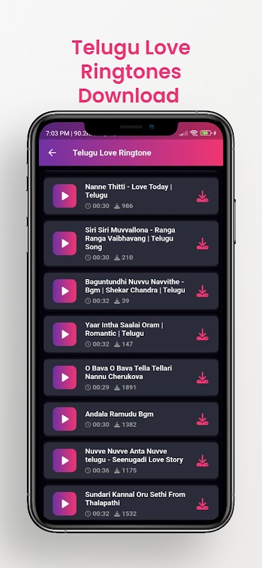 Download the Telugu Ringtones Download App today and add a touch of Telugu culture to your phone's sound! Love Ringtones Telugu, telugu Ringtones is an app that provides a collection of romantic and love-themed ringtones and many more ringtones śśin the Telugu language. The app allows users to browse through a variety of ringtones, preview the audio, and set the ringtones as their default ringtones or notification sounds on their devices.