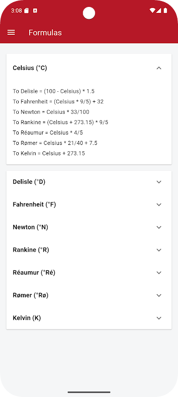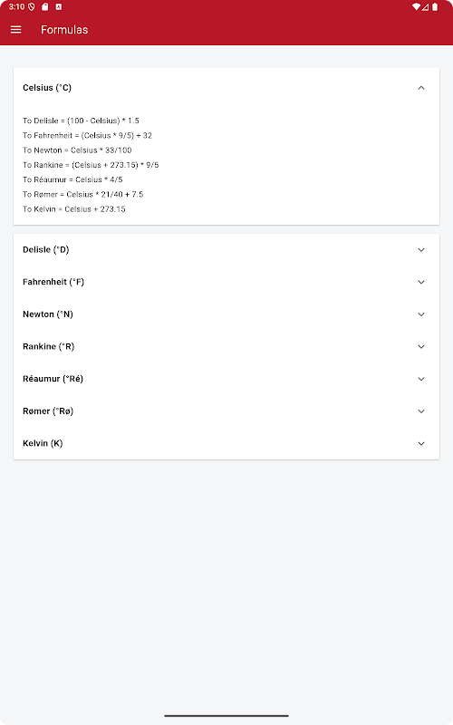 این برنامه از مجموعه ای از فرمول های دقیق برای اطمینان از تبدیل های دقیق برای هر مقیاس دما استفاده می کند. در اینجا فرمول های مورد استفاده برای تبدیل آمده است: