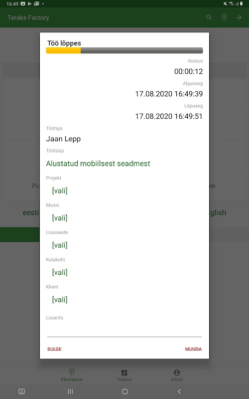 این حالت پیش فرض برای نمای Pinpad است. با دسترسی های صحیح (یعنی کاربر پین صحیحی را وارد می کند) ، کار فعلی تغییر می یابد. اگر کاری برای کاربر در حال انجام باشد ، فسخ می شود. اگر کاربر شغل در حال انجام ندارد ، کار جدیدی شروع می شود. اگر کاربر برای مدت زمان مشخصی یک کار برنامه ریزی شده یا برنامه ریزی شده داشته باشد ، کار برنامه ریزی شده شروع می شود. در غیر این صورت ، سیستم نوع کار انتخاب شده از آخرین / بیشترین شغل های انتخاب شده را جستجو می کند. اگر پیدا نشود ، با شناسه خارجی "از دستگاه همراه شروع شده" یک کار جدید ایجاد می کند و این نوع کار را برای کاربر شروع می کند. NB! می توانید این نوع شغل ایجاد شده را به صورت خودکار تغییر نام دهید.