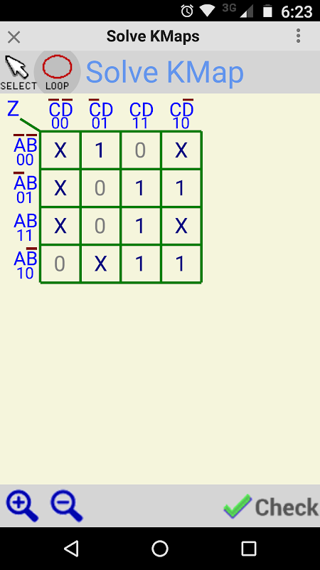 این برنامه یک KMap حل نشده را ارائه می دهد که کاربر با حلقه کردن مقادیر منطقی (1) و / یا Don't Cares (X) آن را حل می کند. هنگامی که کاربر حل KMap را به پایان رساند، دکمه CHECK راه حل را بررسی می کند و یک پیام صحیح یا نادرست می دهد. سپس برنامه همچنین KMap حل شده صحیح را در کنار KMap حل شده توسط کاربر نمایش می دهد. یک گزینه به کاربر این امکان را می دهد که به طور متوالی تمام راه حل های کمینه شده معادل چندگانه را برای نقشه کارناگ انتخاب کند.