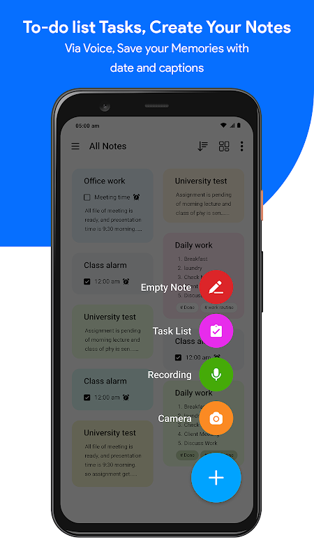 یادداشت نویسی ساده این ویژگی را برای ذخیره عکس ها و فیلم های خود با تاریخ و زمان فراهم می کند، شرح یادداشت های کوتاه بنویسید و آن را برای مدت طولانی در دفترچه یادداشت دیجیتال ذخیره کنید و هر زمان که از برنامه نوت بوک لیست کارها استفاده می کنید به دوستان و خانواده خود نشان دهید. .