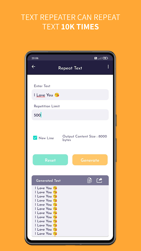 با Text Repeater می توانید بدون زحمت متن را تا 10000 بار تکرار کنید. چه بخواهید 10 هزار بار متن را تکرار کنید، پیامک ایجاد کنید یا ایموجی ها و نمادهای خاص اضافه کنید، این برنامه شما را تحت پوشش قرار می دهد. تکرارکننده متن که برای کارایی و راحتی طراحی شده است، برای WhatsApp، Instagram، Facebook، Snapchat، TikTok، Telegram، YouTube و غیره مناسب است.
