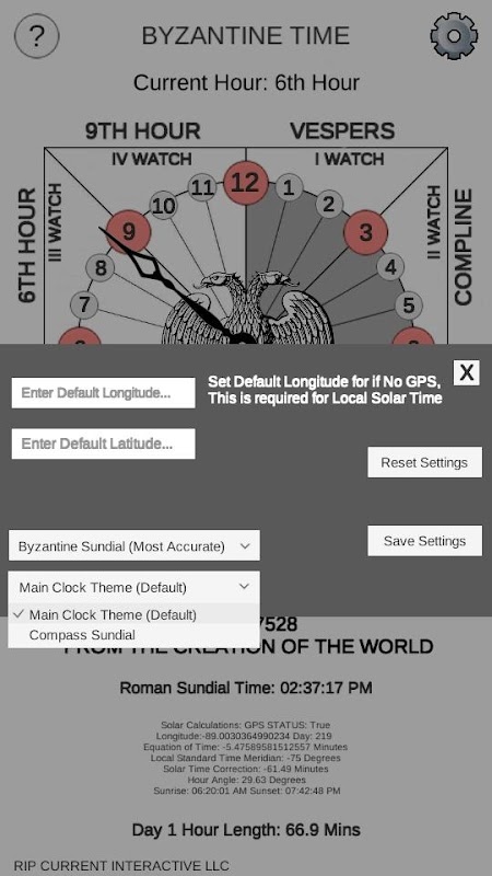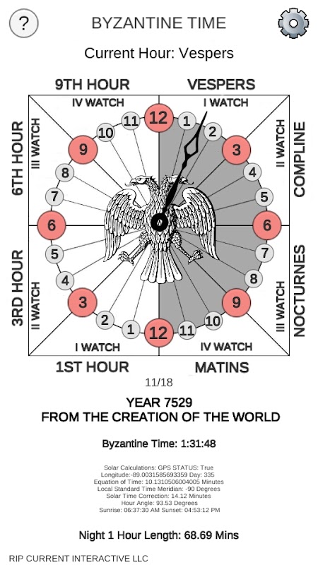 زمان بیزانس حتی قبل از امپراتوری بیزانس که در میان یهودیان باستان یافت می شود، سرچشمه می گیرد. از ساعت های نابرابر مانند ساعت آفتابی استفاده می کند. روز بعد با ساعت های مدرن به جای نیمه شب در عصر شروع می شود. این برنامه برای کار کردن به GPS نیاز دارد، با این حال می توانید به صورت دستی طول و عرض جغرافیایی را در تنظیمات تایپ کنید.