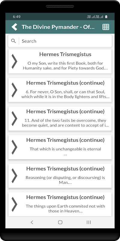 این شامل گفتمانهای هرمس تریزمیستوس در بسیاری از مضامین از جمله: خیر ، شر ، دین ، تقوا ، فضیلت و موارد دیگر است.