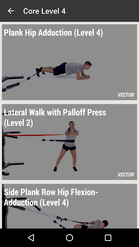 The TheraBand VECTOR exercise library demonstrates a range of progressive exercises organized by body part.