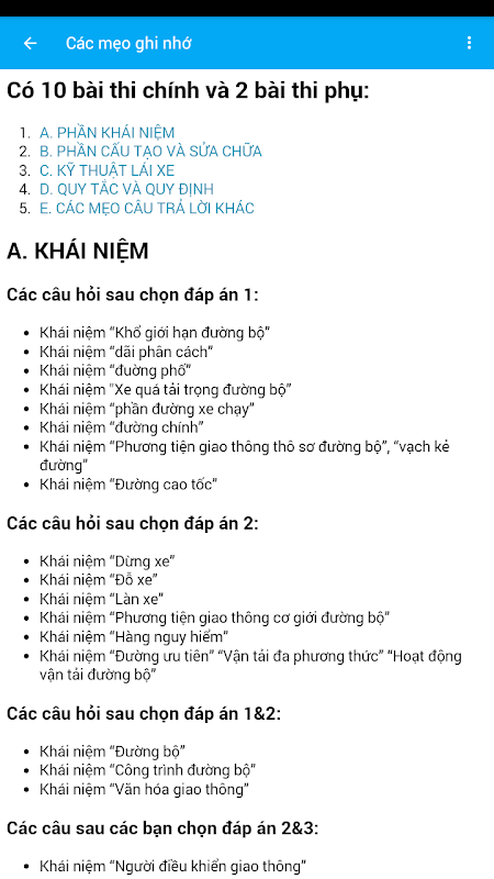 • Danh sách các mẹo trả lời các câu hỏi lý thuyết giúp bạn tham khảo nếu muốn học nhanh và nhớ nhanh (không khuyến khích).