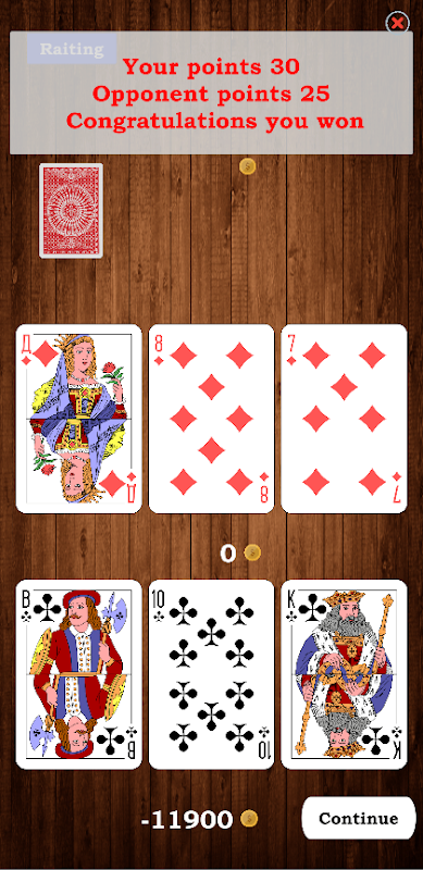 اگر یک بازیکن 31 امتیاز کسب کند ، بازی متوقف می شود و بازیکنان امتیازات را می شمارند ، بازیکنی که بیشترین کارت را دارد برنده می شود.