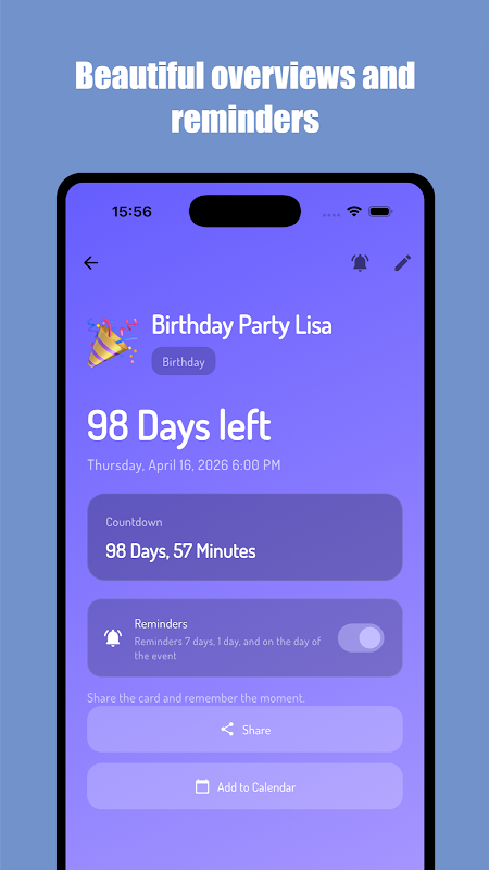 دیگر هرگز یک رویداد مهم را از دست ندهید! TickTickDay به شما کمک میکند تا برای تولدها، تعطیلات، عروسیها، امتحانات و تمام لحظات خاص خود شمارش معکوس ایجاد و پیگیری کنید.