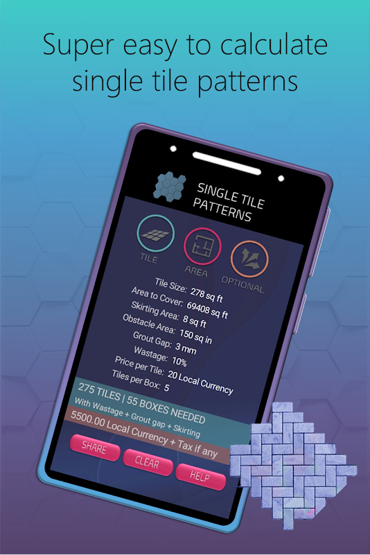 • با استفاده از هر اندازه و شکل کاشی محاسبه کنید.