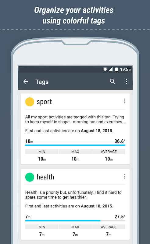 • آسان برای مرور و ویرایش ورود به سیستم زمان (ورود کار، ورود به سیستم فعالیت) (شروع و پایان تغییر تاریخ، شرح، برچسب ها، مدت زمان) است