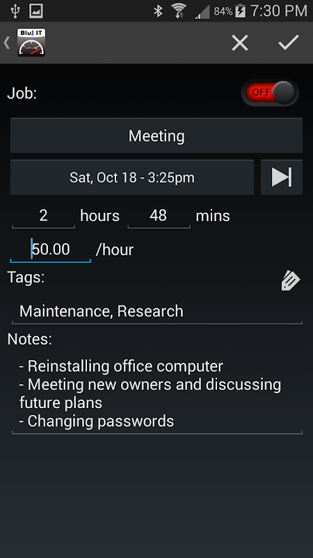 * زمان ویرایش ورود اجازه می دهد تا کاربران برای ورود به زمان در گذشته و همچنین به عنوان آینده . کنترل مستقل برای شروع زمان، آخر زمان، و مدت زمان ورود زمان ارائه شده است.