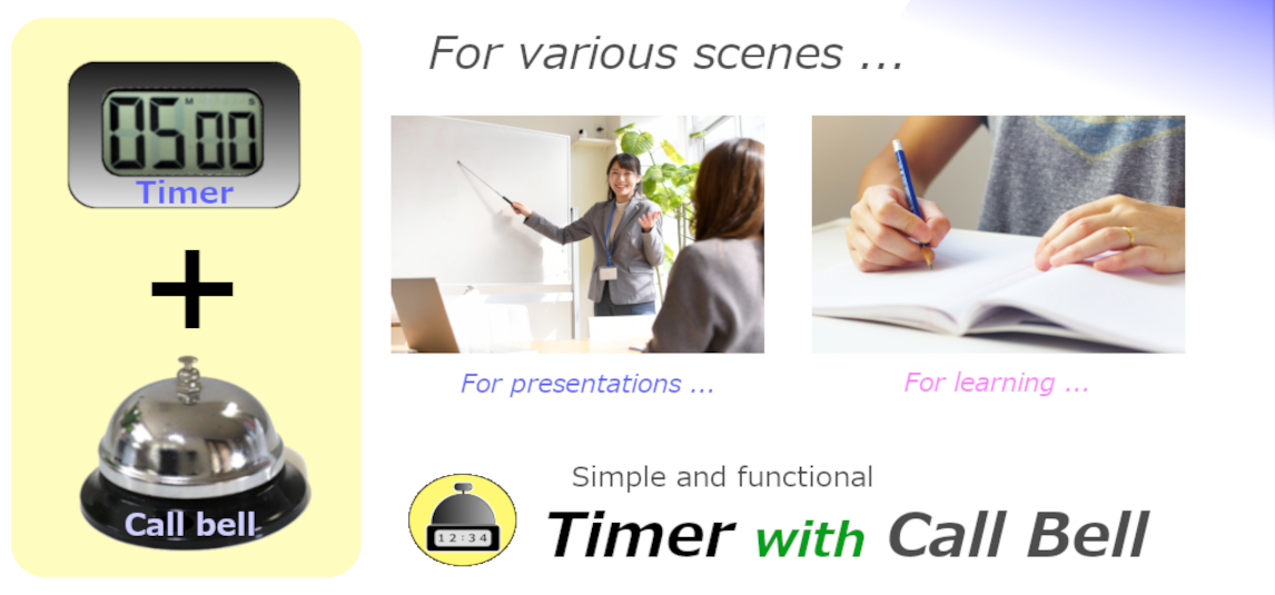 A timer with a call bell suitable for time management such as presentations, meetings, and learning.
