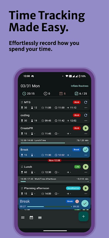 آیا عادات روزانه یا کارهای تکراری دارید که انجام می دهید؟ Mt.Task به شما امکان می دهد تا کارهای معمول خود را از قبل ثبت کنید. این کار "کارهای تکرارشونده امروز باید انجام شود" را روشن میکند و به شما امکان میدهد ثبت آنها را با یک ضربه شروع و متوقف کنید. ضبط روزانه را حتی روانتر میکند و به جلوگیری از ثبتهای از دست رفته کمک میکند.