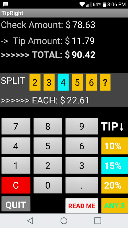 TipRight یک ماشین حساب لایحه رستوران یک صفحه ساده ، سریع ، آسان برای استفاده است. این برای استفاده از تلفن همراه در حالت عمودی طراحی شده است.