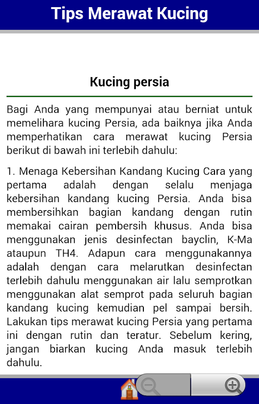 isi dari aplikasi ini meliputi beberapa tips relevan untuk merawat kucing, baik kucing itu tanpa induk, kucing anggora maupun persia.