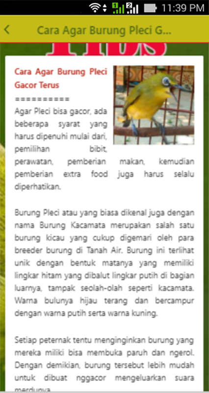 Aplikasi tips pleci gacor ini berisikan lengkap tutorial bagaimana cara tips agar burung pleci gacor terus dengan cara yang baik dan benar dan menghasilkan uang bila pleci ini di ikutsertakan dalam kontes burung. Berikut ini contoh materi yang ada di aplikasi ini: