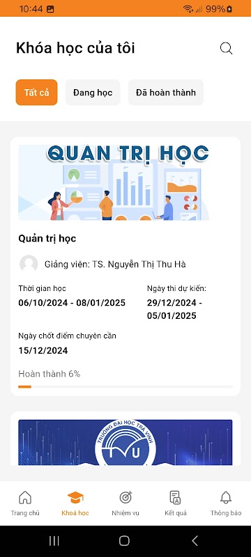 برنامه آموزش آنلاین TMU E-Learning - برنامه آموزش از راه دور دانشگاه Thuongmai یک پلت فرم تلفن همراه پیشرفته و تخصصی است که به دانشجویان و اساتید کمک می کند در طول فرآیند آموزش و یادگیری با هم ارتباط برقرار کنند و با یکدیگر تعامل داشته باشند. این برنامه دسترسی سریع به دوره ها، سخنرانی های آنلاین، مواد مطالعه و برنامه های مطالعه برای هر موضوع را فراهم می کند. دانشآموزان میتوانند تکالیف خود را ارسال کنند، در آزمون شرکت کنند و بازخورد مربیان را مستقیماً از طریق برنامه دریافت کنند.