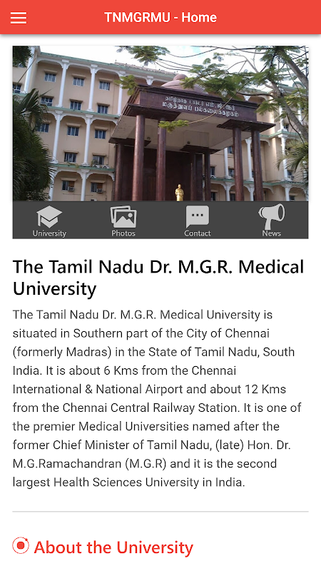 The Tamil Nadu Dr. M.G.R. Medical University is situated in Southern part of the City of Chennai (formerly Madras) in the State of Tamil Nadu, South India. It is about 6 Kms from the Chennai International & National Airport and about 12 Kms from the Chennai Central Railway Station. It is one of the premier Medical Universities named after the former Chief Minister of Tamil Nadu, (late) Hon. Dr. M.G.Ramachandran (M.G.R) and it is the second largest Health Sciences University in India.